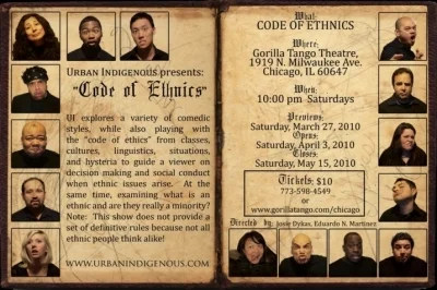 They performed a revue entitled "Code of Ethnics." Urban Indigenous - A Comedic Revolution, Chicago's premiere multi-ethnic cast, transforms the traditional approach to comedy while providing an exciting social outlet to their audiences. In their first full length review "CODE OF ETHNICS", they performed a variety of comedic styles as they examined the "code of ethics" from classes, cultures, linguistics, and other hysterical situations to guide viewers with their decision making and social conduct when ethnic issues arise. They also examined the word ethnic and ask is there really a minority? Note: This show did not provide a set of definitive rules because not all ethnic people think alike!